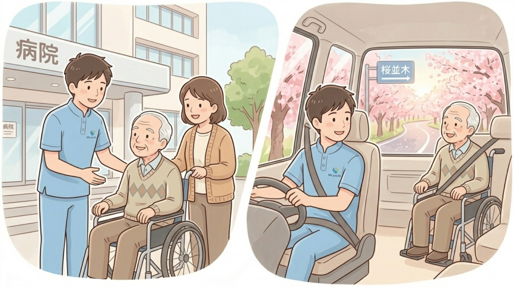 SKCareLifeでは、通院という「義務」の移動時間を、少しでも「楽しみ」の時間に変えられるよう工夫しています。
