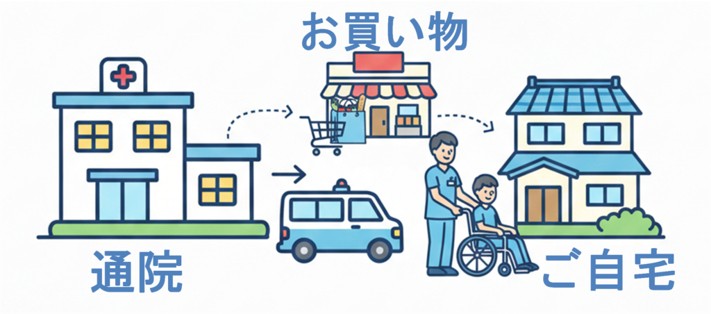 - 内容:病院へお迎え ⇨ スーパーでの買い物付き添い ⇨ ご自宅(荷物の運び入れまで)