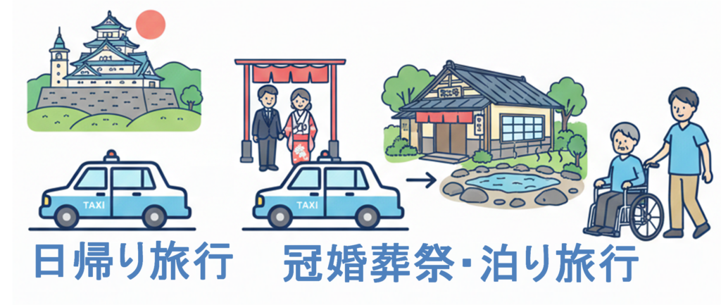 - 宿泊旅行:温泉旅行や遠方の実家への帰省(数日間の同行も可能)。