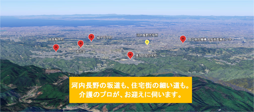 拠点の河内長野市千代田南町から市内全域、『乗車距離』か『『時間制運賃』と『介助時間』だけで計算する、納得の料金体系です。